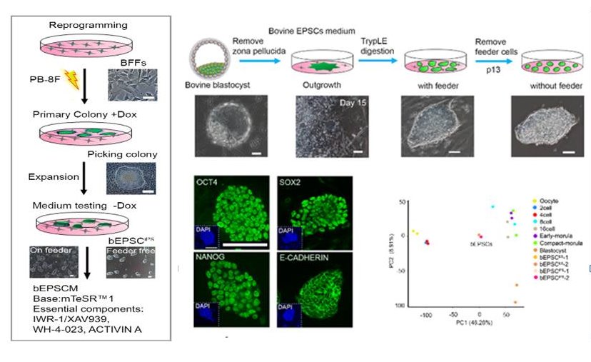 该研究通过TET-ON piggyBac系统重编程技术,采用项目合作单位联合设计的“8因子诱导组合”与自主研制的干细胞特定培养体系,经过前后五年、数百次的干细胞诱导关键技术探讨与干细胞培养关键因子检测试验,成功获得了由体细胞(bovine MEF)与早期胚胎细胞(bovine Blastocyst) 建立的两组多能性拓展的新型牛干细胞bEPSCips bEPSCES。通过体内、体外干细胞分化和嵌合实验证明这两种bEPSCs具有三胚层分化潜能, 其干细胞生物学定位在早期胚胎8-CellMorula阶段,与前期国内外同类研究相比充分显示了本研究获得的新型干细胞拓展多能性。