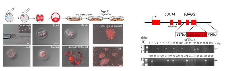 进一步研究显示,获得的两组拓展多能牛新型干细胞bEPSCs,能够通过细胞核移植SCNT技术重新构建“克隆胚胎”,由其诱导再生出次代牛新型干细胞,该细胞基因编辑效率可达22.9%,证明本研究建立的拓展多能新型牛干细胞遗传特性稳定,这一点对于干细胞的家畜生物育种与临床应用非常重要。目前,李喜和教授团队采用该项新技术已经建立了TOP遗传品质的种质奶牛干细胞系,并开展奶牛生物育种开发应用。
