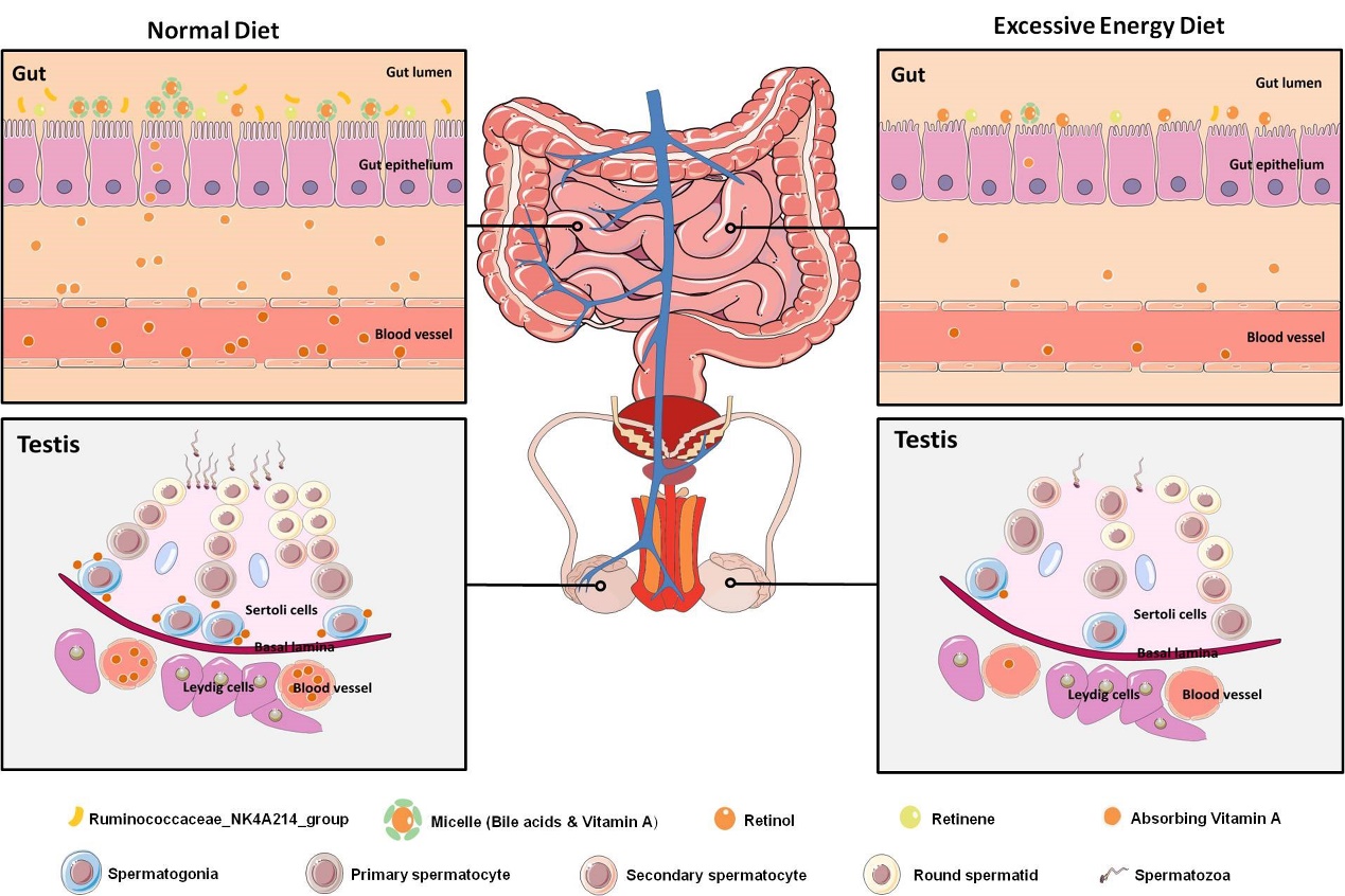 草原家畜健康繁殖和种质资源保护的前提是产生高质量的“种子”—精子和卵子。过度的能量摄入是代谢紊乱的高风险因素之一,代谢紊乱可诱发机体多种慢性疾病的发生,也会诱发睾丸内微环境改变,导致精子发生异常。代谢紊乱还会诱发肠道菌群失调,最近有研究证实,肠道菌群失调和精子发生异常存在密切联系,但二者之间的关键的作用途径尚不清楚。