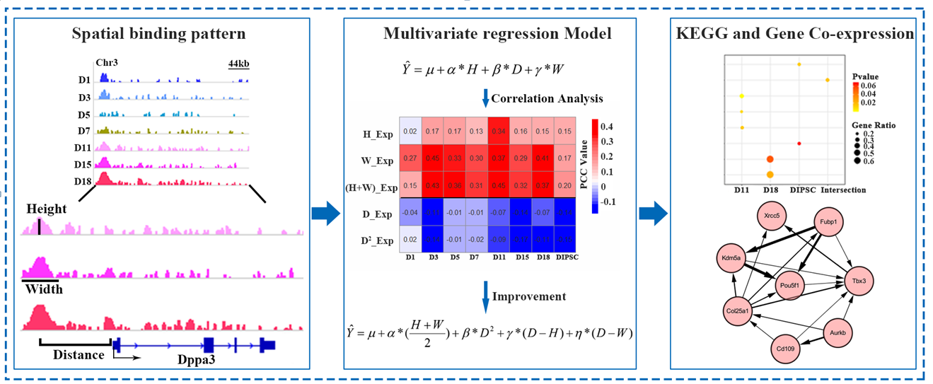 此外,本研究发现在重编程过程中Oct4作用于其靶基因的空间结合模式是动态变化的。特别是结合峰的高度和宽度随着重编程过程的发生逐渐增加,但结合峰距靶基因TSS的距离却呈现减小的趋势。重要的是,宽度的显著增加与靶基因激活表达是一致的。与之相反,结合峰距靶基因TSS的距离与基因表达呈负相关,其中宽度在调控靶基因表达中起着更为重要的作用。最后,该研究引入多元线性回归方法建立了Oct4的空间结合模型。结果证实,结合峰的高度、宽度与基因表达呈正相关。与乘项相比,高与宽的加和交互项能更好地优化模型性能。改进后模型的平均可决系数为81.38%。基于最优模型,筛选出一些在重编程过程中与Oct4协同调控发挥作用的多能性基因,以期为细胞重编程中先锋因子空间结合模式的协同调控提供新的见解,进而为提高TF介导的重编程效率提供一定帮助。