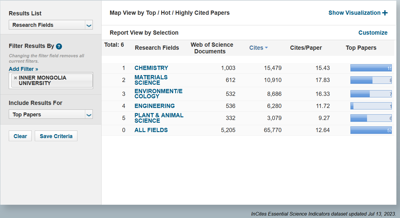 根据科睿唯安(Clarivate Analytics)基本科学指标数据库(Essential Science Indicators,简称ESI)北京时间2023年7月13日公布的最新数据,内蒙古大学植物与动物科学学科进入ESI全球前1%。这期进入ESI植物与动物科学的1669所机构,我校排1666位,共发表论文332篇,总被引次数为3079次,篇均被引次数为9.27次。本次ESI统计数据范围覆盖时间为2013年1月1日至2023年4月30日。