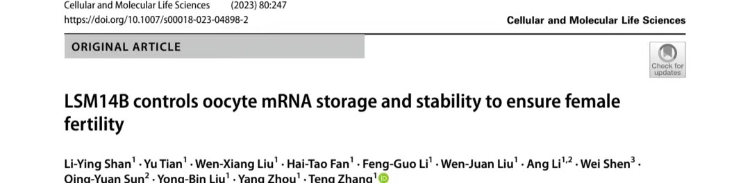 近日,内蒙古大学肉羊团队以Article形式在Cellular and Molecular Life Sciences(发表当年IF=9.2)上发表了题为“LSM14B controls oocyte mRNA storage and stability to ensure female fertility”的研究成果。该团队深入探究了在NGO中LSM14B对原始卵泡组装和母源mRNA储存的作用以及在FGO中决定卵母细胞质量的机制。