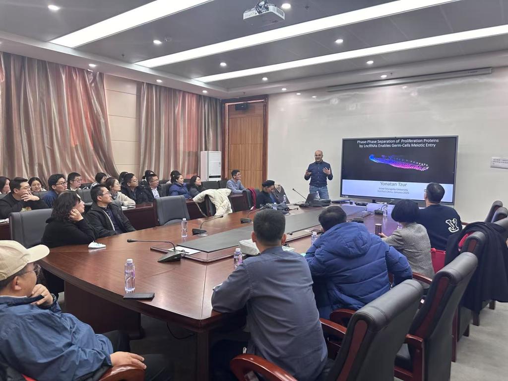 Yonatan B. Tzur教授长期致力于生殖细胞发育与衰老、非编码RNA以及基因编辑的研究,相关研究成果发表于Nature Communications、Genetics、Aging Cell、RNA Biology等高水平期刊。 Yonatan B. Tzur教授首先对耶路撒冷希伯来大学做了简要介绍并欢迎内蒙古大学师生前往访问,随后与现场师生积极互动,指出减数分裂中染色体分离异常造成的非整倍性在哺乳动物卵细胞中出现的概率高达40%-60%。Yonatan B. Tzur教授在报告中着重介绍了非编码RNA对秀丽线虫生殖腺发育及生殖干细胞维持的调控作用。三个长链非编码RNA linc-4linc-7linc-29与生殖腺中表达的转录因子FBF-1、FBF-2结合,通过调控相分离的方式将FBF-1和FBF-2禁锢在生殖腺中特定的生殖颗粒中,进而调控生殖干细胞的分化以及减数分裂的进行。
