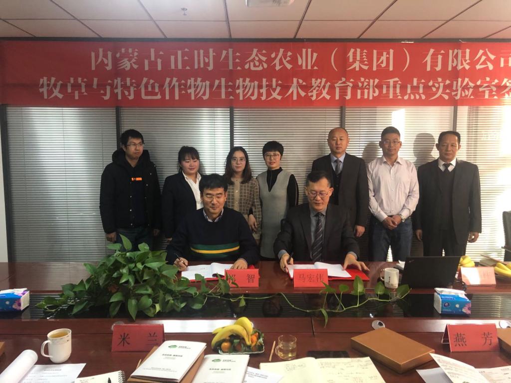 12月27日上午, “牧草与特色作物生物技术教育部重点实验室” 和内蒙古正时生态农业(集团)有限公司在内蒙古呼和浩特市举行了签约仪式,生命科学学院祁智教授代表牧草与特色作物生物技术教育部重点实验室作讲话;马宏伟总裁与祁智教授签署了合作协议;马宏伟总裁向祁智教授颁发了聘书;米兰博士,孙永伟博士,燕芳博士, 轩辕国超博士;内蒙古正时草业有限责任公司总经理李福柱、生产厂长李文亮、农机总监苏俊喜和技术总监刘丽平参加会议。