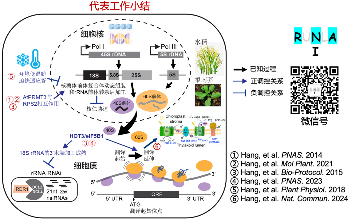 在攻读博士学位和开展博士后研究工作期间,杭润来博士以双子叶模式植物拟南芥和单子叶粮食作物水稻为研究对象,围绕植物核糖体生物合成与蛋白翻译调控参与植物环境适应的科学问题,展开了系统研究,取得了一系列研究成果:(1). 率先报道拟南芥中存在可变的rRNA前体加工方式 (Hang, et al. 2014. Proc Natl Acad Sci U S A) ,该工作入选2014年中国植物科学若干领域重要研究进展。 (2). 证明了拟南芥精氨酸甲基转移酶PRMT3与RPS2B的相互作用对核糖体前体复合体动态组装和抑制核仁胁迫的重要性 (Hang, et al. 2021. Molecular Plant) 。 (3). 揭示了低温胁迫调控水稻rRNA转录后加工的调控特征 (Hang, et al. 2018. Plant Physiology) 。 (4). 系统解析了高等植物核糖体后期组装过程中18S rRNA的3’末端加工成熟的精细过程,揭示了HOT3/eIF5B1所介导的mRNA翻译起始、核糖体后期加工以及rRNA的RNA干扰之间的相互调控关系 (Hang, et al. 2015. Bio-protocol; Hang, et al. 2023. Proc Natl Acad Sci U S A) 。(5). 开发了基于Ribo-seq计算蛋白翻译起始效率的新方法,系统解析了植物光合系统通过反式作用因子和顺式作用元件促进蛋白翻译、叶绿体发育和光合作用的规律,揭示了翻译起始调控的新机制,为合成生物学和植物分子工厂的理性设计提供了新思路,为提高作物高光效和碳中和提供了新的理论基础 (Hang, et al. 2024. Nature Communications) 。