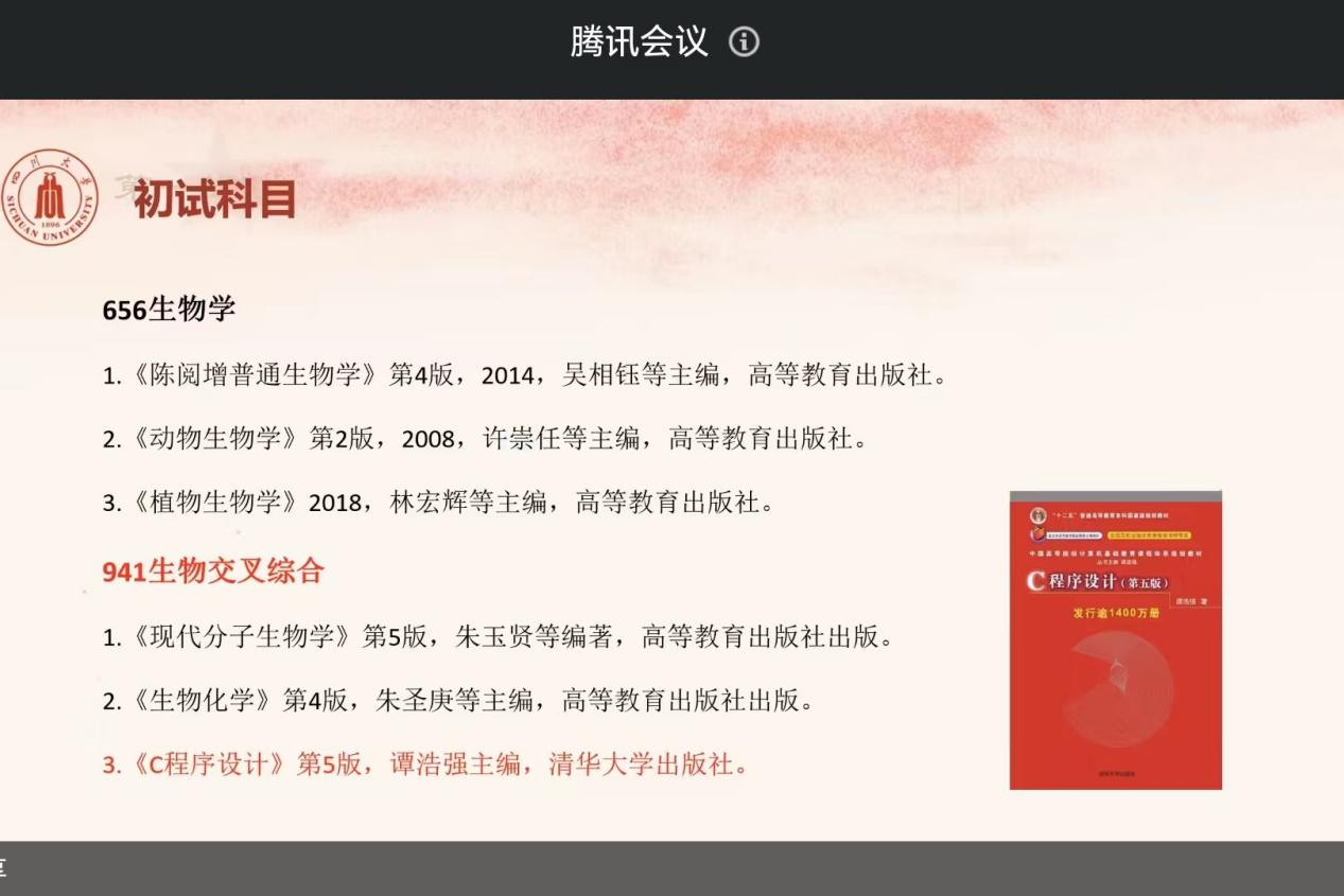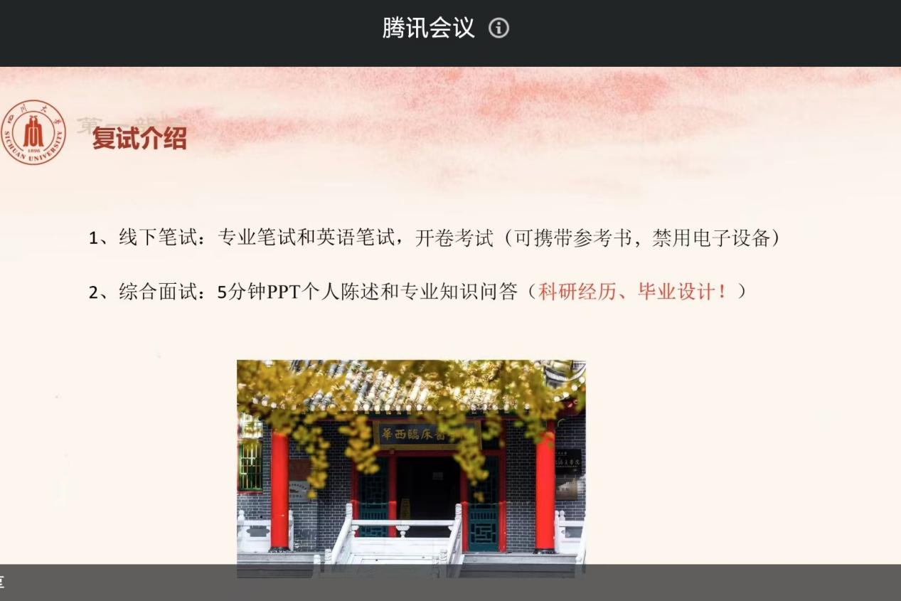 春风得意时,少年凌云日。为营造良好的学习氛围,激发同学们考研的积极性和主动性,提高考研学子的信心与决心,生命科学学院于2023年11月18日召开了线上考研经验分享会。由成功上岸四川大学生物学的2023届生物技术基地的陈文龙学长为大家分享考研经验。此次分享会主要面向生命科学学院2024届参加考研的毕业生,分享会由团委书记兼学工办主任季晓岚老师主持。