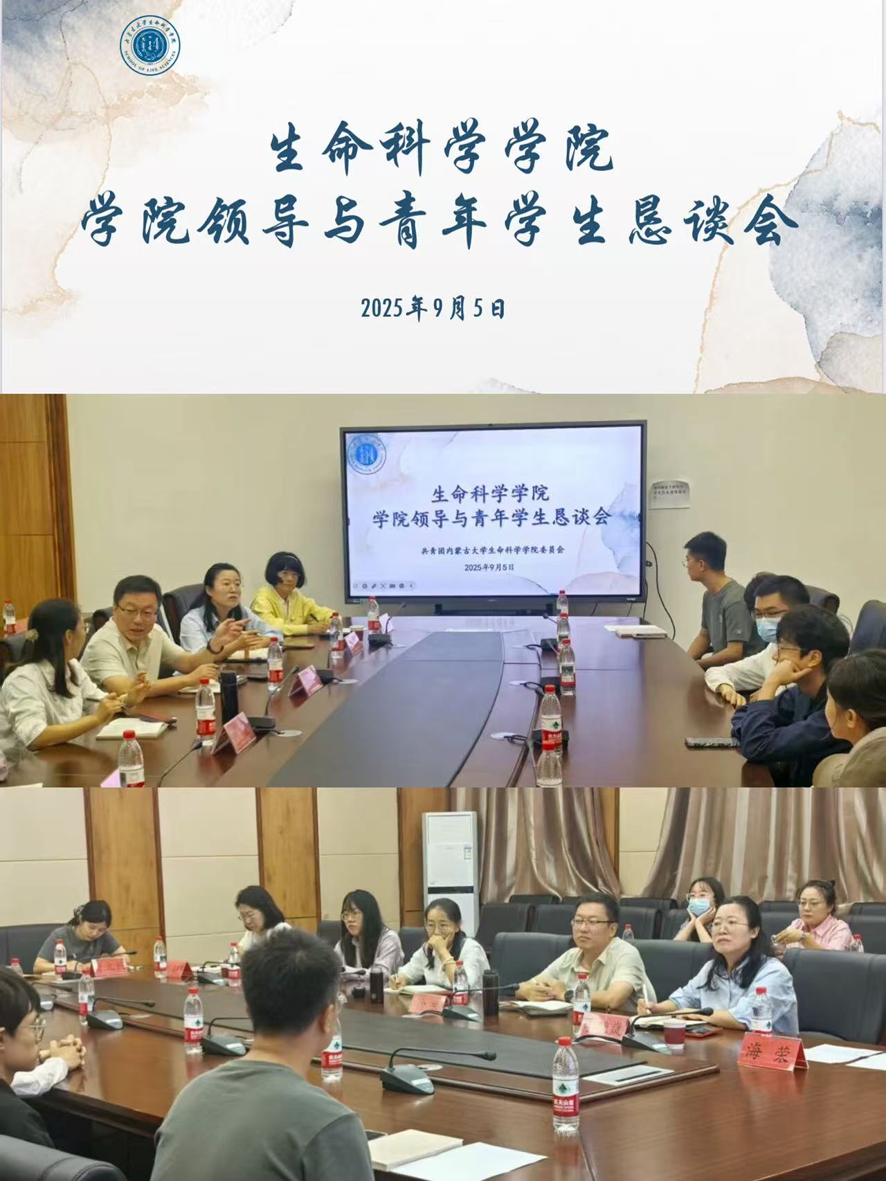 2025年9月5日上午10:00,生命科学学院在国重120会议室召开学院领导与青年学生恳谈会,内蒙古大学学术副校长兼生命科学学院院长胡薇、生命科学学院党委书记徐军、党委副书记季晓岚、内蒙古大学团委挂职副书记娜仁其其格、陈辰,生命科学学院行政办、教务办、学科科研办、学工办负责人以及学院青年学生代表30余人参会,团委副书记兼学生工作办公室副主任管文荻老师主持会议。