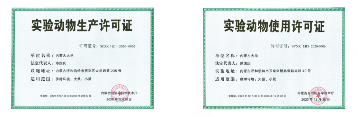 内蒙古大学SPF级实验动物室始建于1986年,随着生物学一流学科建设和省部共建草原家畜生殖调控与繁育国家重点实验室的建设,实验动物室进行了多次升级改造。1999年首次取得《实验动物生产许可证》和《实验动物使用许可证》,是自治区第一个国家标准化实验动物的繁育基地。2012年,南校区的新建实验动物室正式投入运行,并申请了《实验动物使用许可证》。2019年,按照国家标准《实验动物环境及设施》(GB14925-2010)的要求,结合省部共建国家重点实验室使用动物的实际情况,对动物室进行了系统性整体升级并全方位消毒灭菌,增设了屏障环境(SPF)+IVC独立通风系统和智能中央排气通风笼盒系统(EVC小鼠笼),极大地提升了动物实验室使用效率,优化了动物室的使用功能。