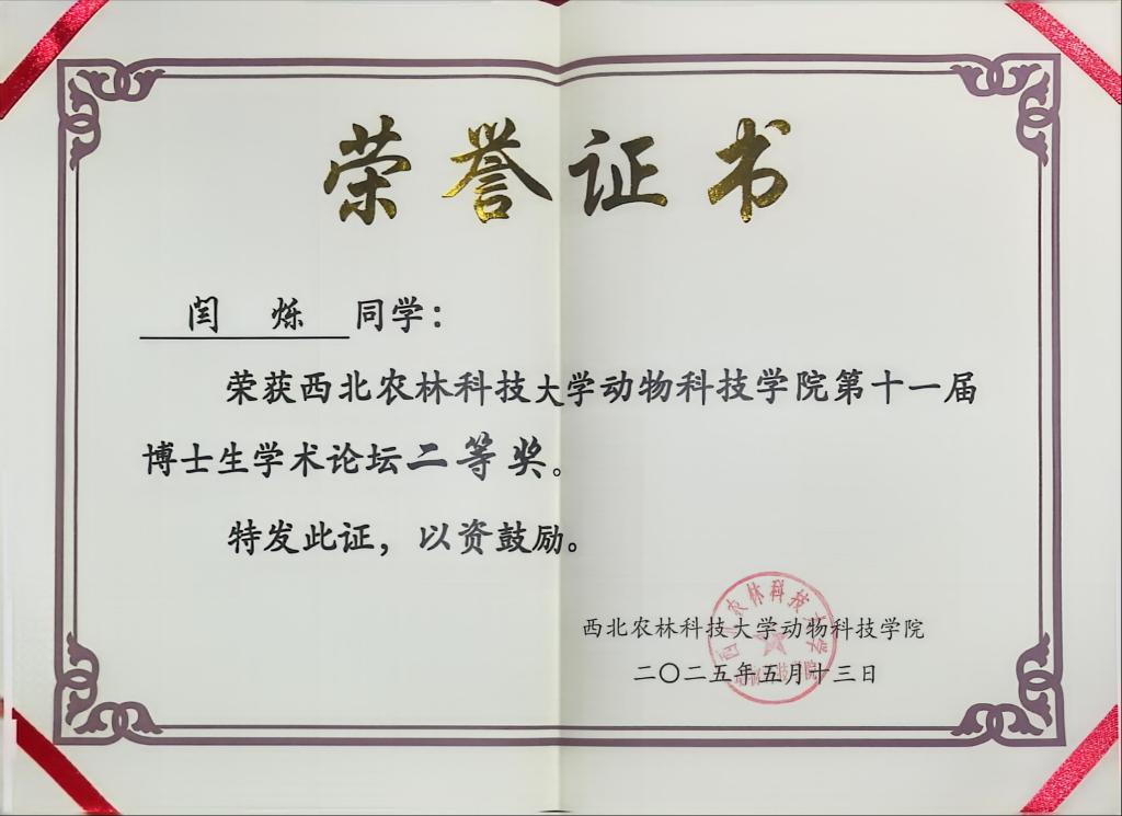 DB中国旗舰官方网站博士研究生闫烁荣获西北农林科技大学动物科技学院第十一届博士生学术论坛二等奖